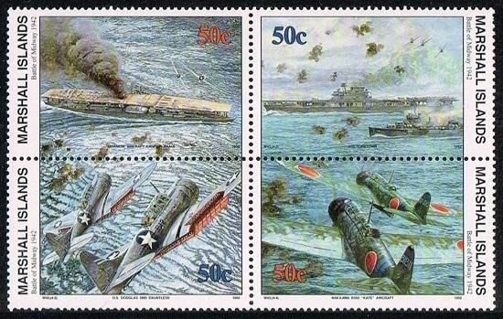 ミッドウェー海戦の切手 マーシャル諸島1992年4種田型 太平洋戦争・船・飛行機