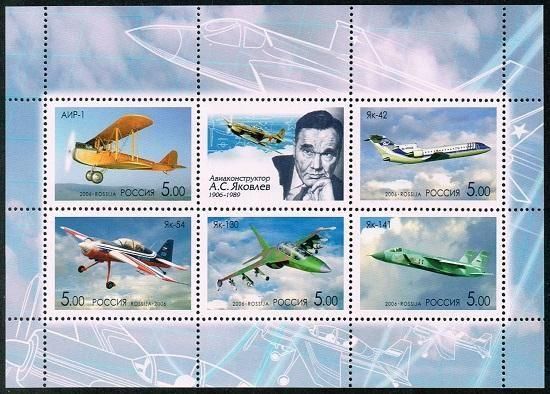 飛行機の切手 ロシア2006年・ヤコブレフ生誕100年5種連刷シート 戦闘機