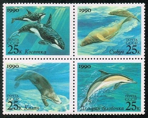 海生哺乳類の切手 ソ連1990年4種田型完 イルカ・シャチ