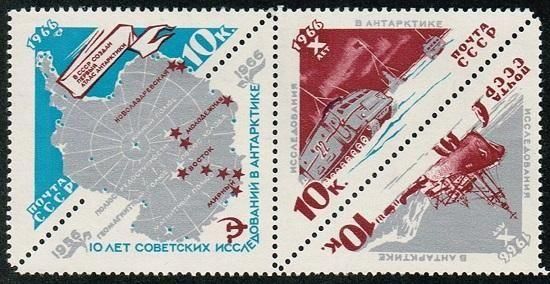 南極調査10年の切手 ソ連1966年3種連刷完 鳥(ペンギン)・雪上自動車・飛行機・船