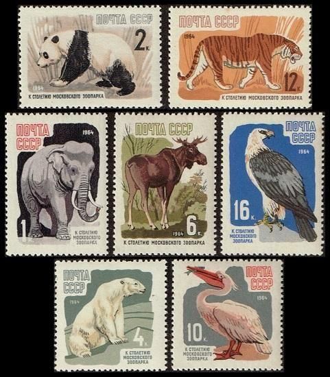 モスクワ動物園100年の切手 ソ連1964年7種完 鳥・魚・パンダ