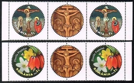 イースターの切手 ルーマニア2016年2種完ガッターペア 花・昆虫(蜂)・変形切手